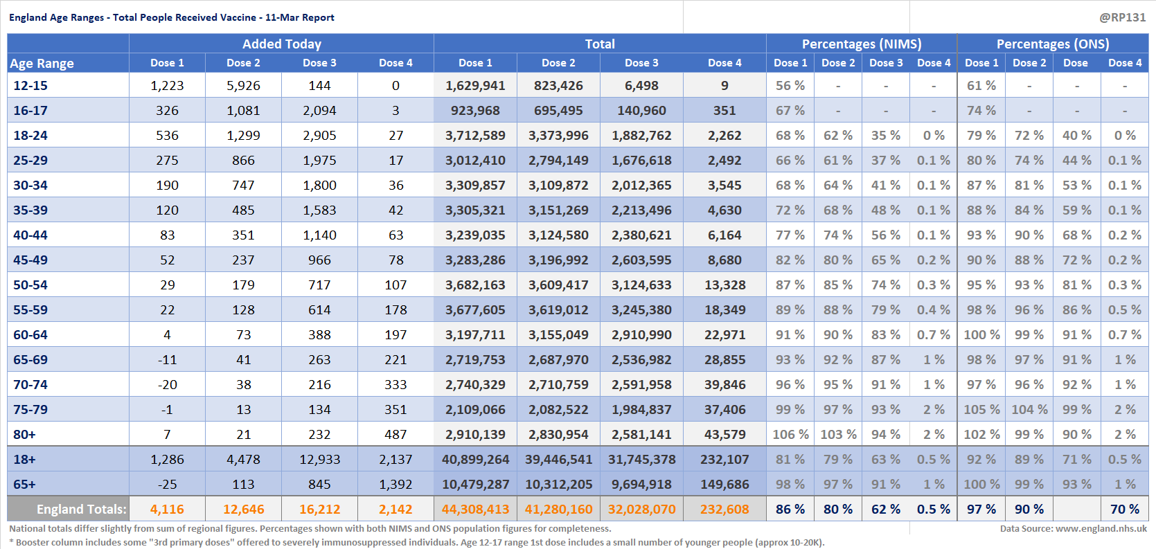 [2/3] Very detailed table view of today's (11-Mar) updated England vaccination data by age ranges.